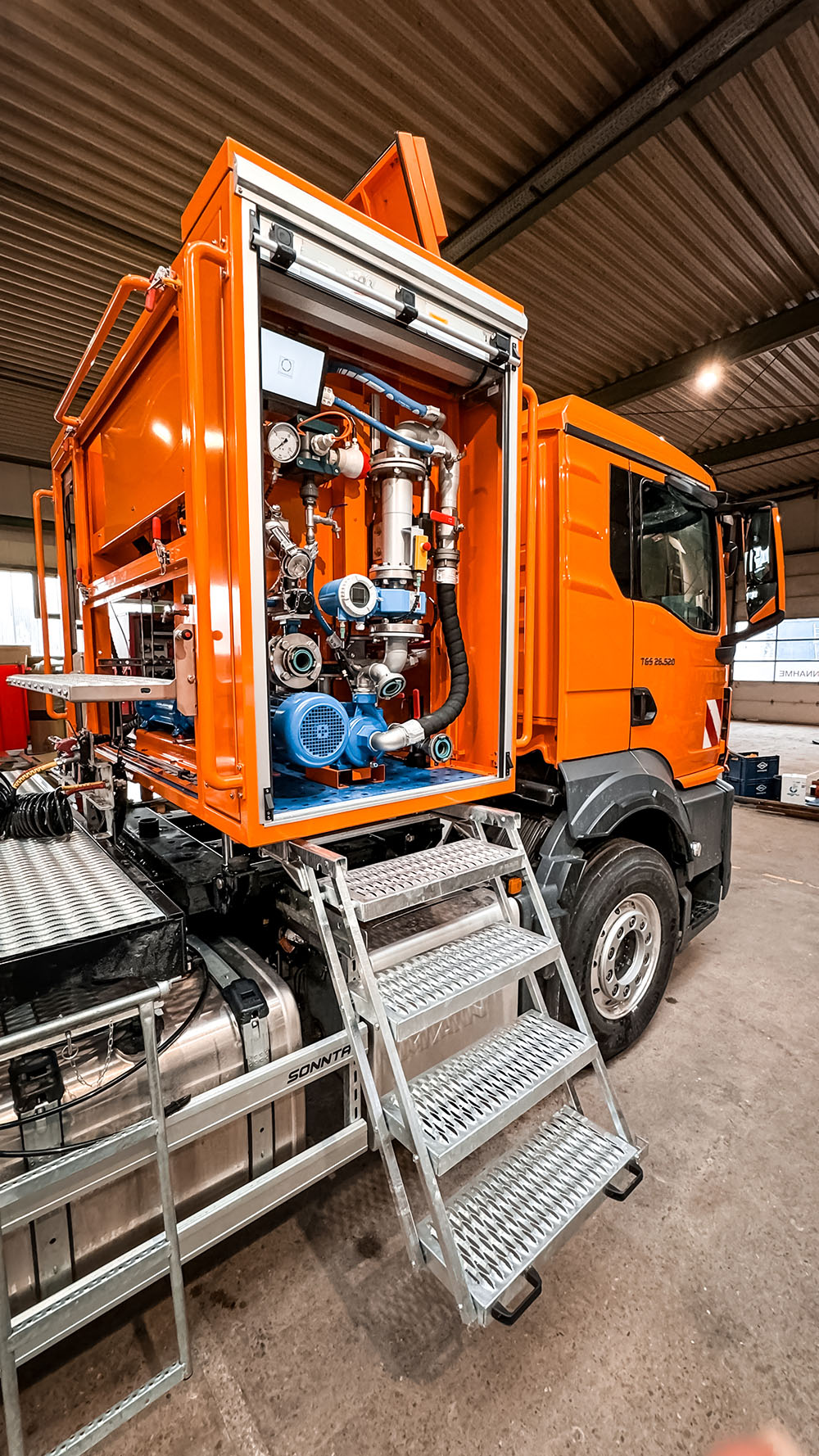 Auf besonderen Kundenwunsch wurde der mobile Ölabscheider nicht wie üblich auf einem Anhänger montiert, sondern direkt auf der Zugmaschine eines Saug-Drucktankwagenaufliegers. Diese innovative Lösung ermöglicht es dem Kunden, den Ölabscheider besonders flexibel und effizient an verschiedenen Einsatzorten zu nutzen. Die Anpassung des Systems an die Fahrzeugstruktur zeigt, wie OKO-tech mit individuellen Lösungen für die industrielle Abwasserbehandlung auf spezielle Anforderungen eingeht und diese erfolgreich umsetzt.
