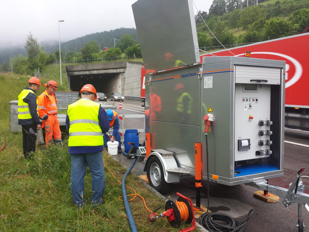 Die Waschwasseraufbereitung aus der Tunnelreinigung ist ein wichtiger Schritt, um Umweltauswirkungen zu minimieren und gesetzliche Anforderungen zu erfüllen. In der Schweiz reinigen Tunnelbetreiber regelmäßig die Tunnelröhren, indem sie Tenside einsetzen, um Ruß, Straßenschmutz und andere Verunreinigungen zu entfernen. Das dabei anfallende Waschwasser wird gesammelt und muss entsprechend behandelt werden. Hier kommt die mobile OKO-aquaclean®-Anlage ins Spiel, die speziell für solche Herausforderungen entwickelt wurde und eine umweltfreundliche Lösung zur Behandlung von Waschwasser aus der Tunnelreinigung bietet.